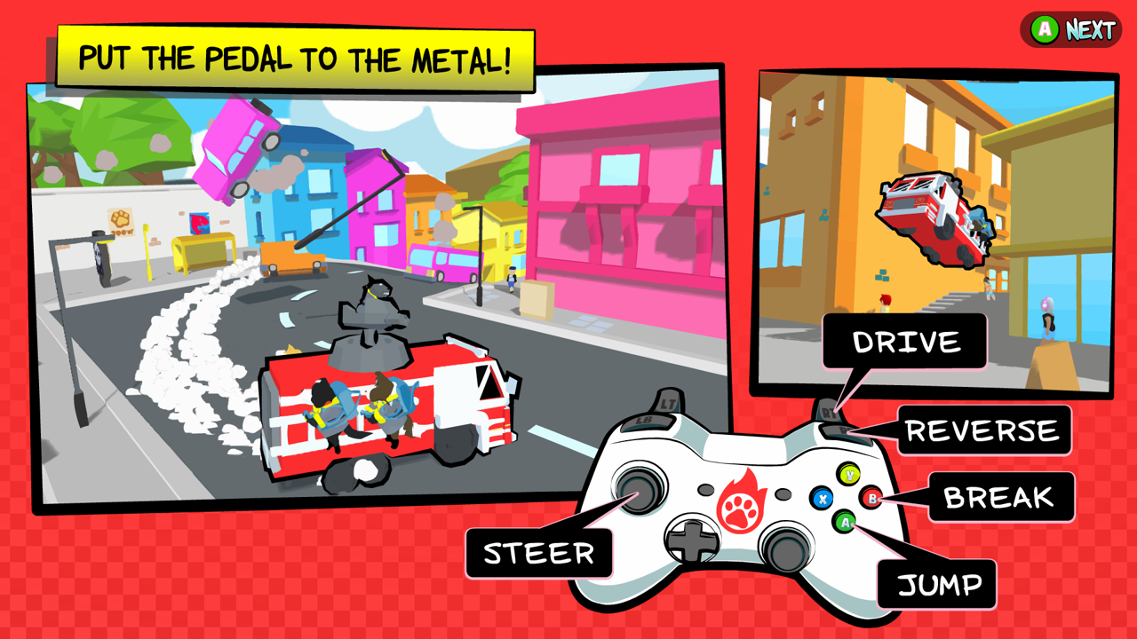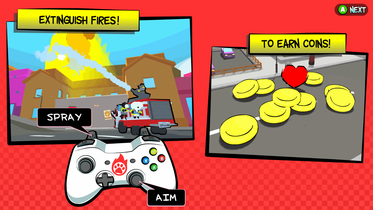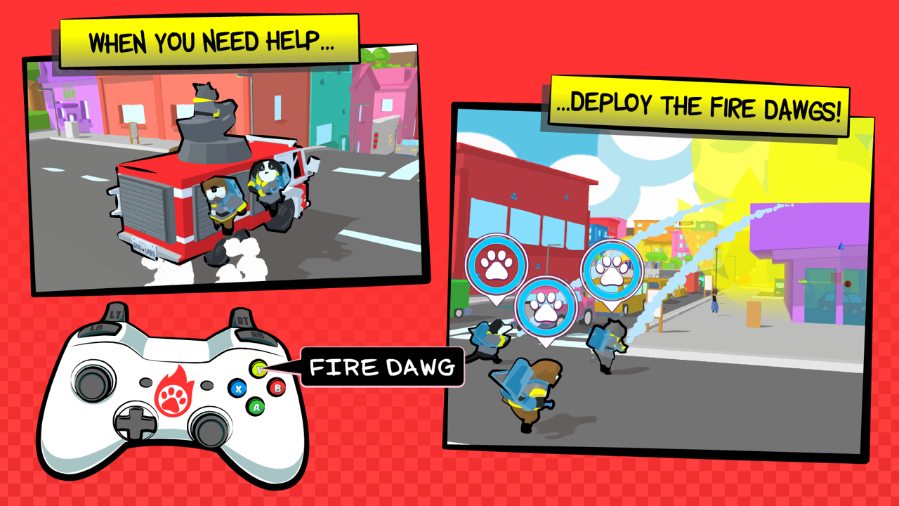 Fires have sprouted up all over town, it’s up to you to put them out in this arcade style firetruck-em-up! Play as a squad of dogs who fight fires, filling in for the firemen who caught fleas! Drive through various open worlds fighting fire, saving townsfolk and building the best FireDawg Squad around!